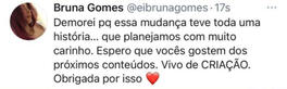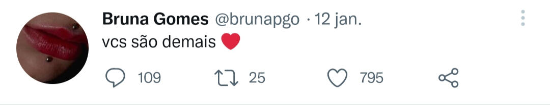 "Ser fã da Bruna, ou melhor, ser uma chatiadissima da Bru, um sorvetinho dela é uma das melhores experiências que você pode ter na sua vida. Começando pelo conteúdo dela que além de vídeos engraçados ela fala sobre assuntos importantes que tornam ela muito mais humana e ainda de quebra nos confortam o coração. Você pode fazer mil postagens para ela e pensar que ela não liga ou não está vendo, mas ela sempre está de olho em tudo e quando você menos esperar ela vai te surpreender com um like, repost ou até uma resposta super carinhosa. E ela é isso: carinho. Você vai receber o melhor abraço do mundo e perceber que ela é exatamente o que mostra nas redes sociais... atenciosa, amorosa, dedicada e você se sentirá o melhor fã do mundo. E é... ela tem os melhores fãs do mundo porque ela merece. 🥺💖" - cyn @brunamemes